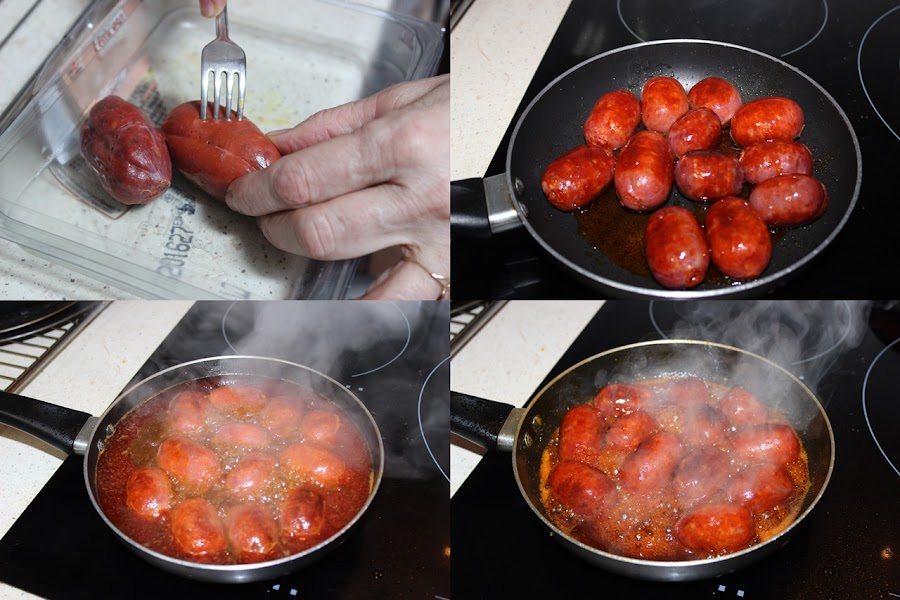 Primero pincharemos los chorizos con un palillo o tenedor para que puedan soltar la grasa mientras hierven, o bien los podemos cortar en rodajas gruesas. Yo he usado choricitos pequeños para hacerlos.