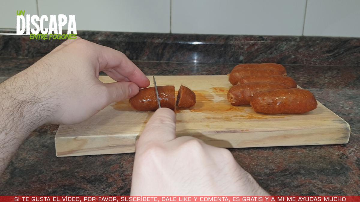 4Mientras se va reduciendo la salsa, vamos a cortar los chorizos, yo los voy a cortar de unos 2 centímetros de grosor aproximadamente.