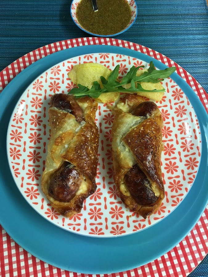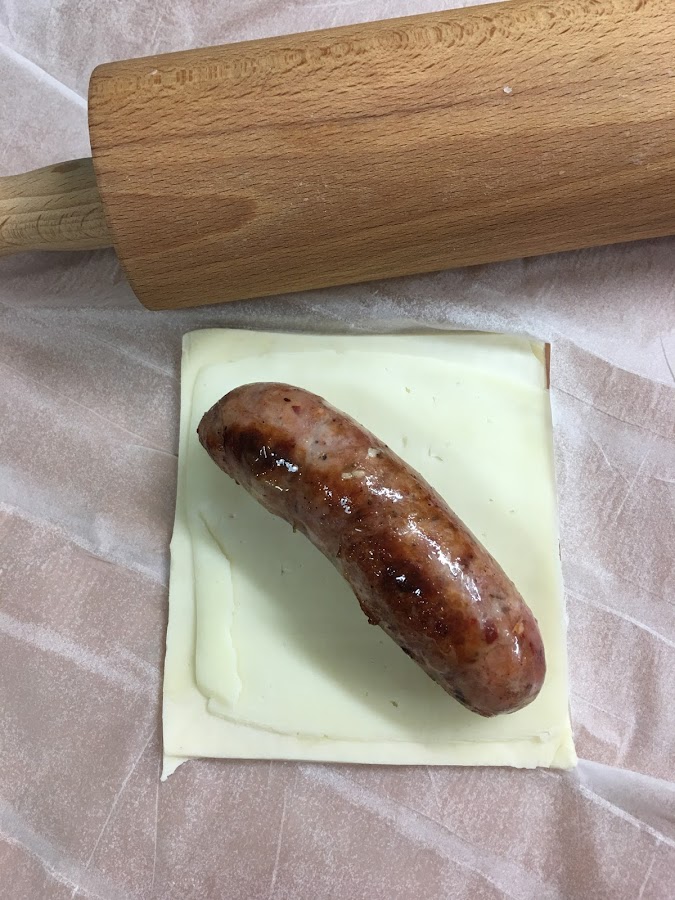 Se cortan los bordes, dejando cuatro cuadrados. Con los recortes hacemos una bola, estiramos la masa y hacemos el quinto rectángulo. Se pone la salchicha en diagonal y se enrolla la masa de hojaldre como haciendo un pañuelo: