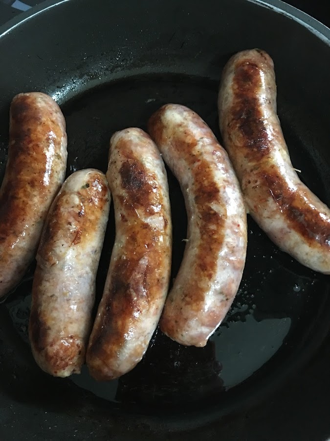 Mientras tanto, se pone una pizca de aceite de oliva en una sartén y se fríen los chorizos a fuego un poco alto al principio (para que se doren) y se baja después.