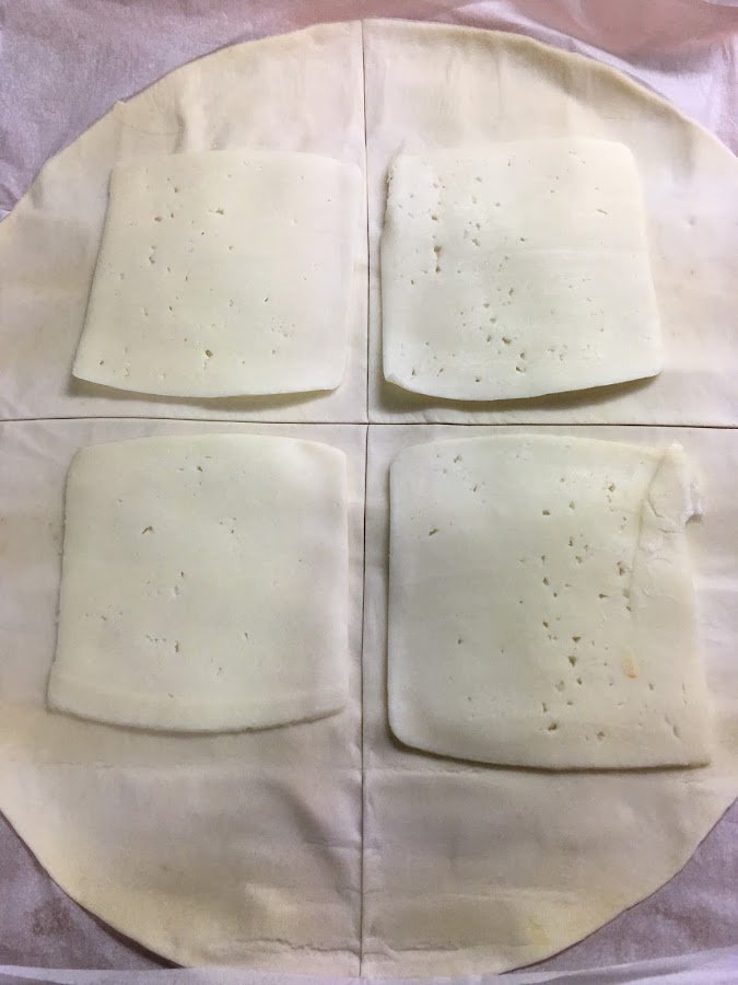 Se desenrolla la lámina de hojaldre y se corta en cuatro partes. Se pone una loncha de queso en cada una de ellas: