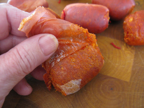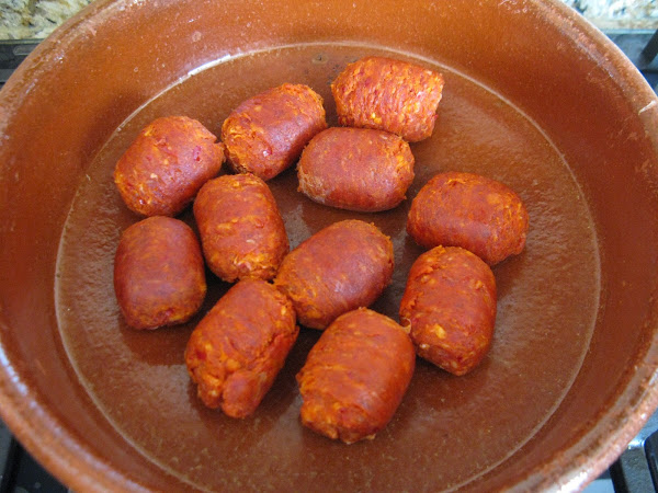 Chorizos crudos de los que llaman de rosario, pequeños y redondos. Se puede hacer con cualquier otro tipo de chorizo.