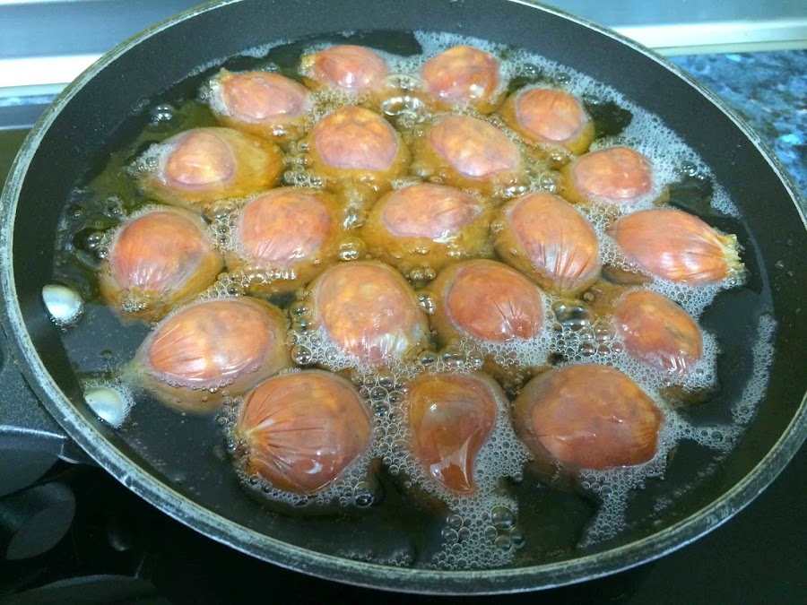 Separamos los chorizos y los añadimos a la sartén una vez que la manteca esté derretida.