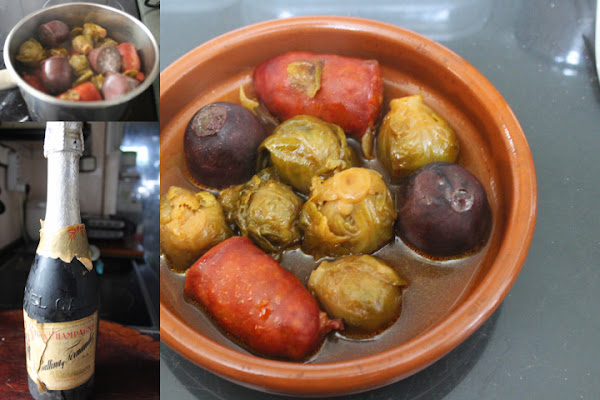 Como somos poco adictos a las bebidas espumosas, encontré perdida en un armario una botella de sidra llena de telarañas y con la etiqueta podrida, aprovechando que tenía unas coles de Bruselas congeladas cocidas, unos chorizos y unas morcillas en el frigorífico, se me ocurrió aprovechar para deshacerme de la sidra y trabajar poco en la cocina.