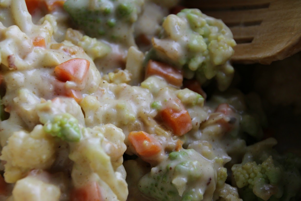 Vierte la bechamel, sobre las verduras. Remueve para que se distribuya bien