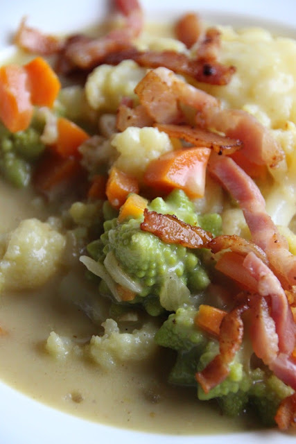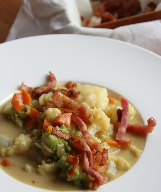 No, caldo, no... más denso. Y pedazos de tropezones, de verdura, bacon...
