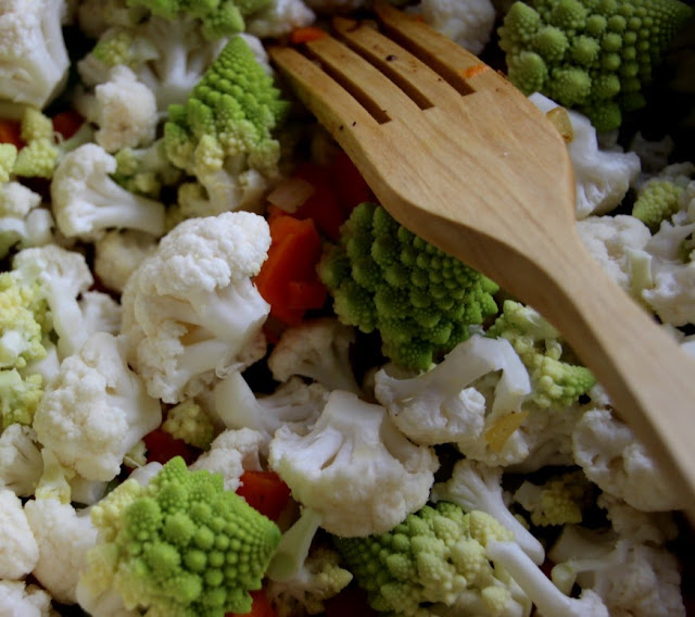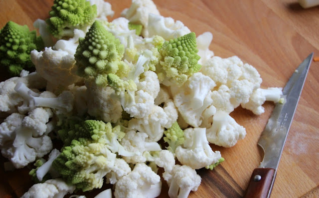 Troceamos la coliflor y la romanescu, en pedazos de bocado.