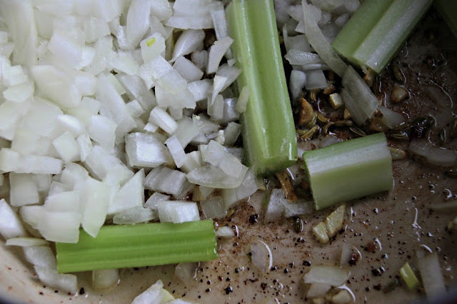 Añadimos la cebolla picada y el apio, en trozos grandes, (lo retiraremos al final) sofreímos unos minutos .