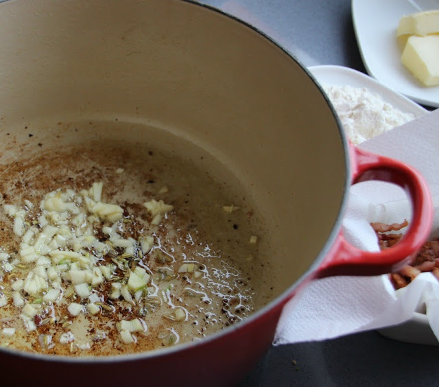 En una cazuela, doramos el bacon. Lo retiramos, reservandolo sobre papel absorbente, y en la misma grasa que ha soltado, ponemos el ajo y las semillas de hinojo.