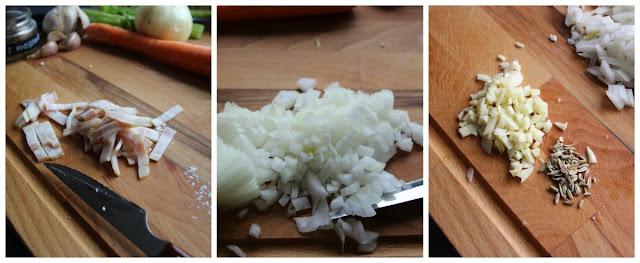 Picamos el bacon, la cebolla, el ajo y preparamos las semillas de hinojo.