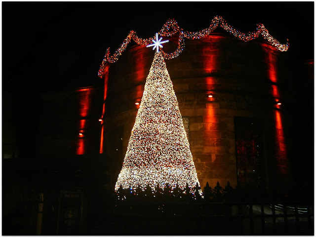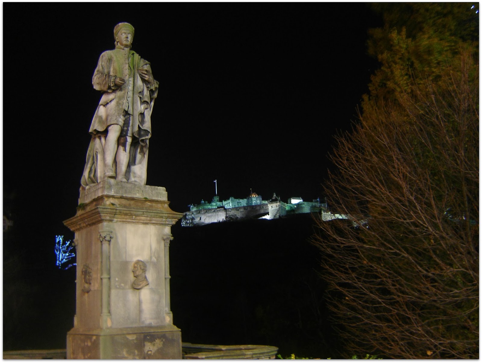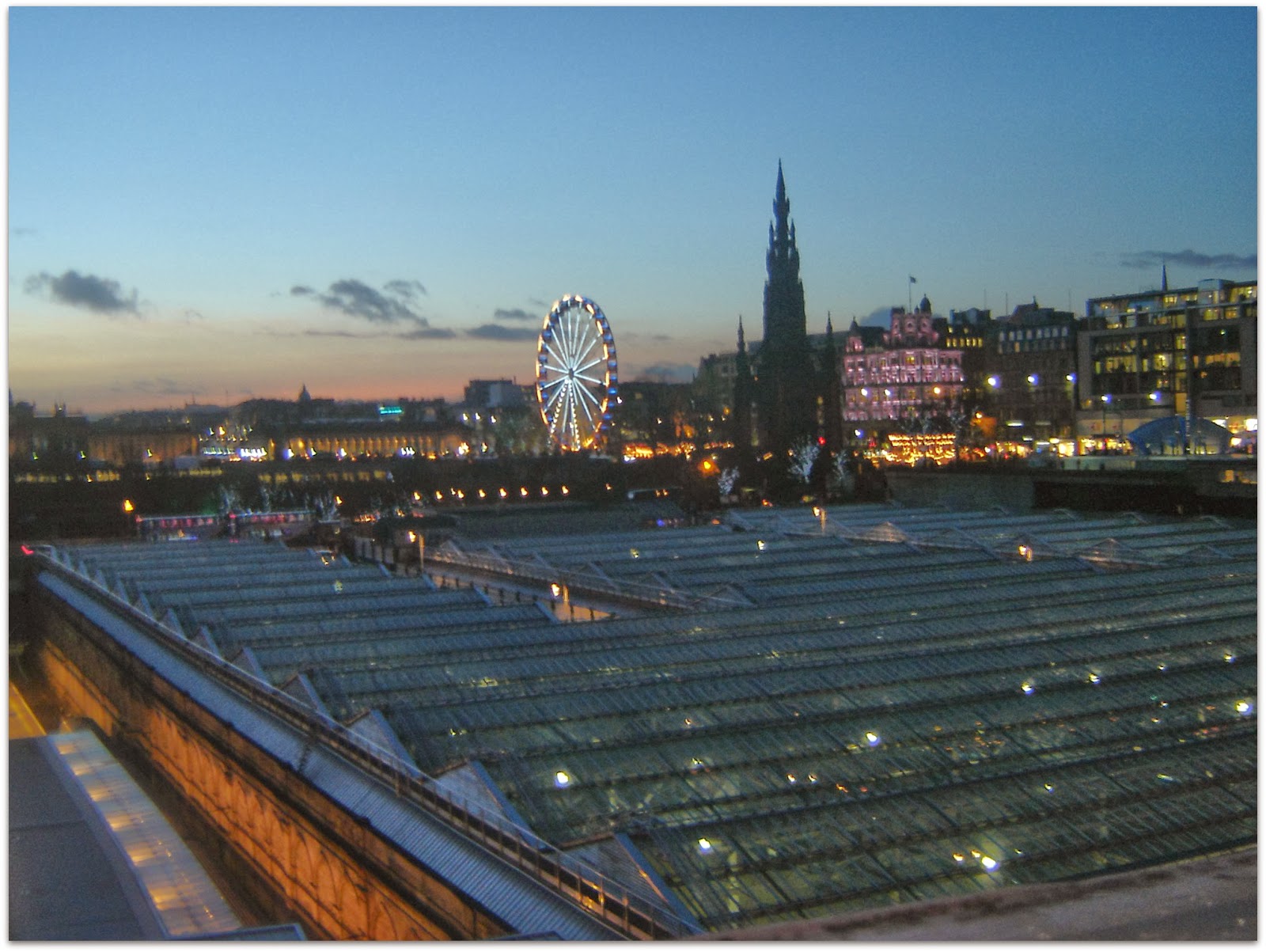 Éstas son las vistas desde el puente George IV situado en el casco histórico de la ciudad. Podéis ver la noria y parte de la iluminación navideña, destacando el monumento al escritor Sir Walter Scott.