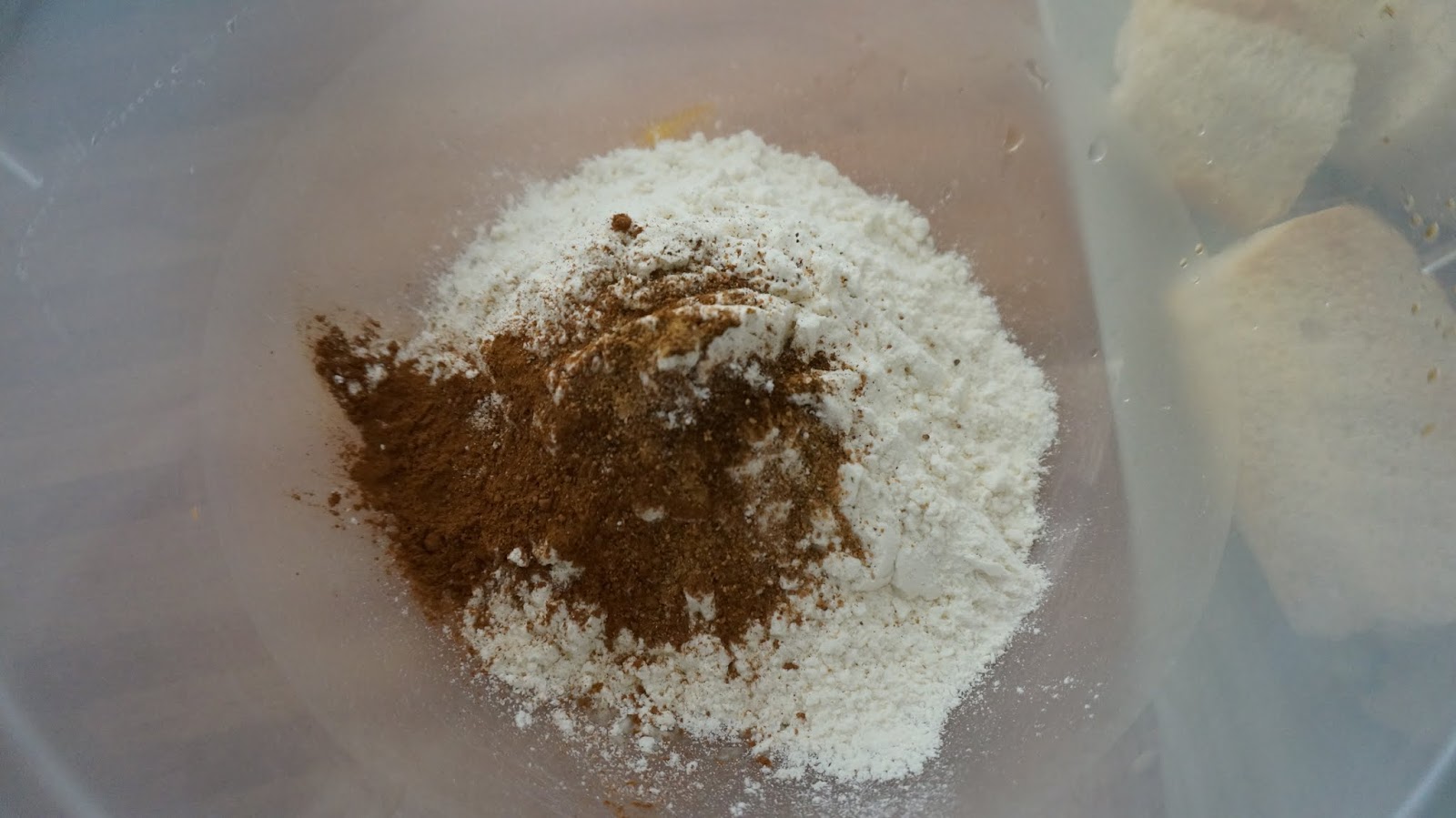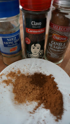 Mezcla la harina con las especias ( yo le puse 1 y 1/2 cdita de canela, 1/4 cdita de nuez moscada y 1/4 cdita de clavo molido)