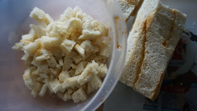 Al día siguiente, descorteza el pan, y pesa 100 gr , córtalo en cubitos pequeños