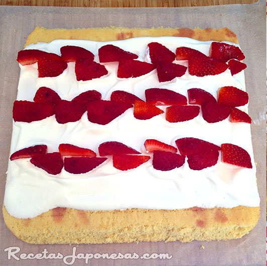 8. Coloca una cantidad generosa de nata (crema de leche) sobre el bizcocho excepto 2,5cm por cada lado, coloca tres filas de fresas dejando un lado más vacío. Enrolla el rollcake ayudándote con el papel de horno y presionando firmemente, con el mismo