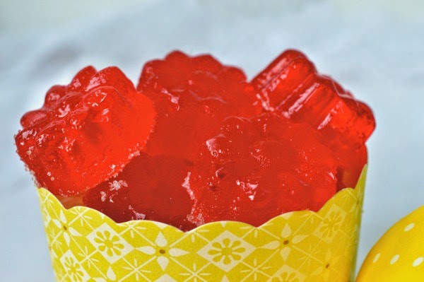 * Si queremos hacer las gomitas de naranja, de limón o de piña, por ejemplo, sustituiremos la gelatina de sabor a fresa por otra del sabor que queramos.