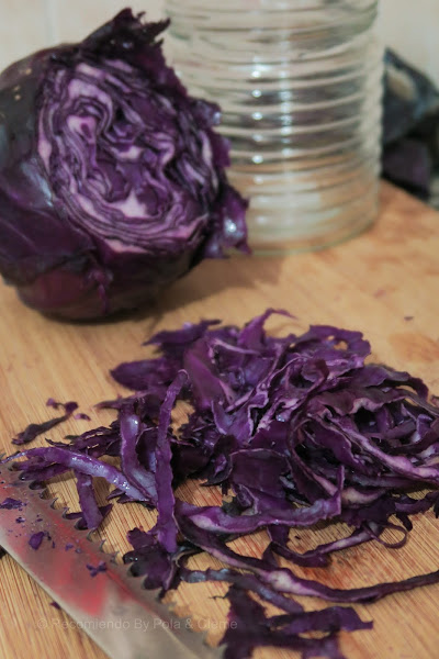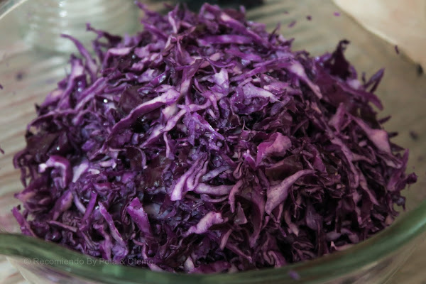 Poner en una fuente de vidrio y añadir la sal (como si fueras a aliñar una ensalada) y con las manos, masajear hasta que comience a botar líquido y el volumen del repollo baje un poco. Puedes corroborar la sal, de acuerdo a tu gusto.