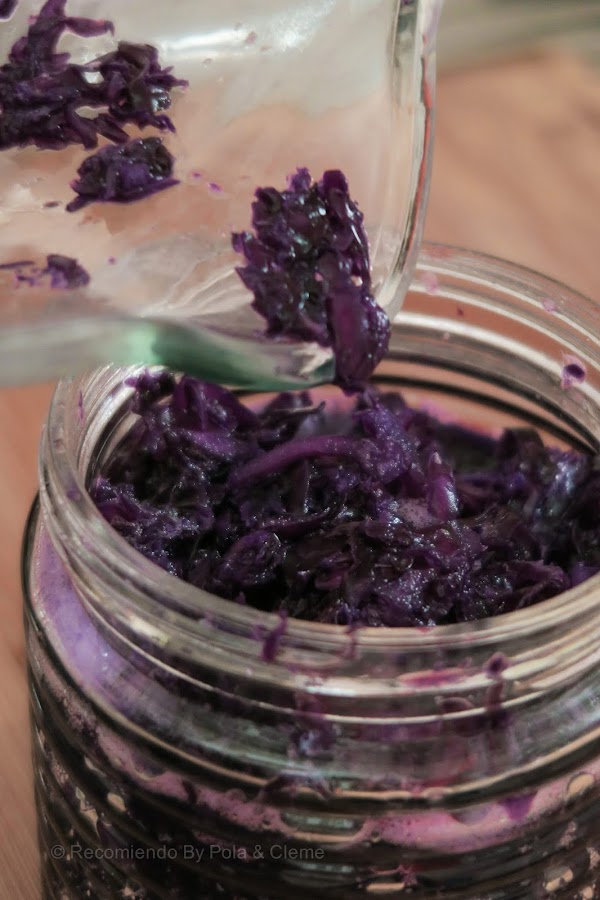 Llevar el repollo con el líquido, a un frasco, que no llene su capacidad total y hacer presión con ayuda de una cuchara de madera o el puño de la mano, hasta que el líquido suba y el sólido (repollo) quede abajo bien prensado. Colocar las hojas reservadas sobre el repollo y volver a empujar. Debe quedar cubierto por aproximadamente 3 cms. de líquido.