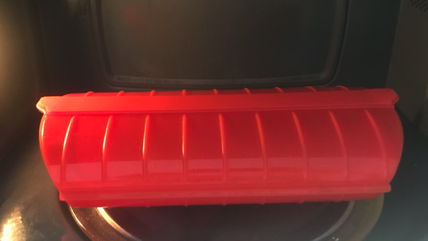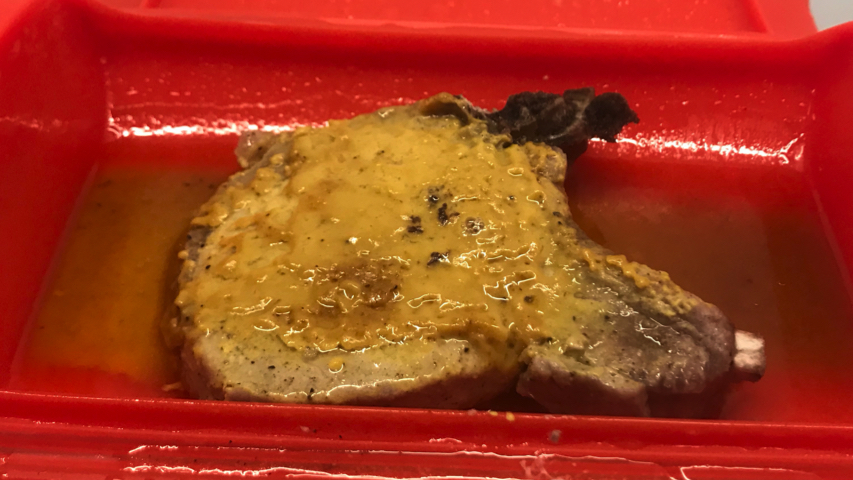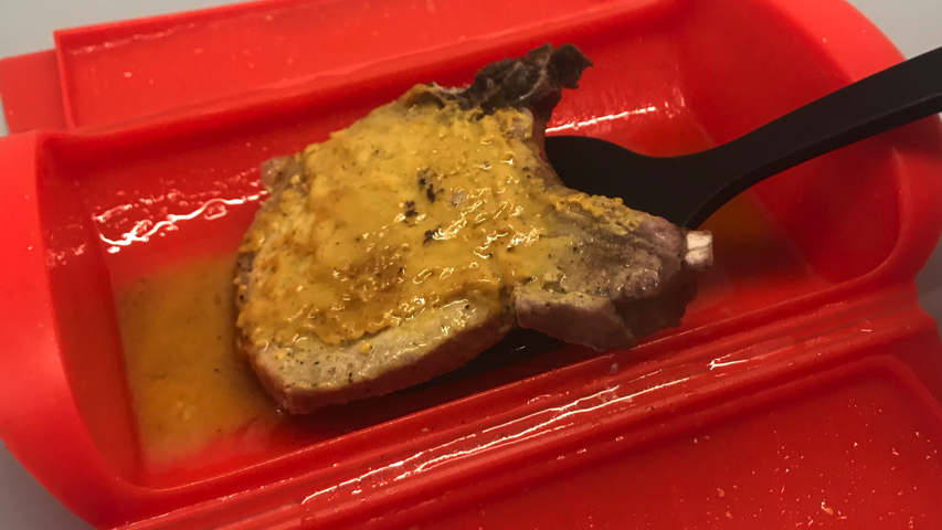 Cierra el estuche y al microondas, a máxima potencia (750 W) durante 5 minutos. Vigila la chuleta a partir del minuto 3 para ver si está ya hecha. Sácala y pínchala con un tenedor. Si no esta hecha a tu gusto introdúcela de nuevo en el micro hasta que esté.