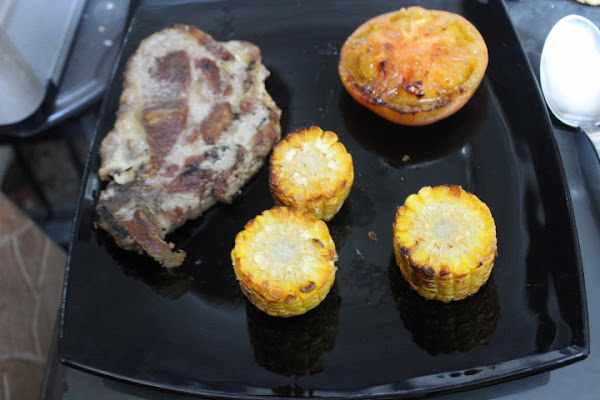Colocar medio tomate, una chuleta y tres rodajas de maíz en cada plato.