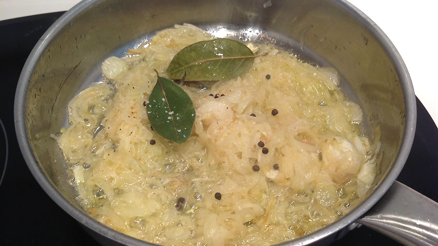 Pocha la cebolla con sal, unos granos de pimienta negra y un par de hojas de laurel.
