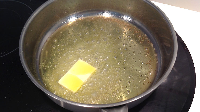 Empezamos poniendo una cazuela al fuego con aceite de oliva y mantequilla.