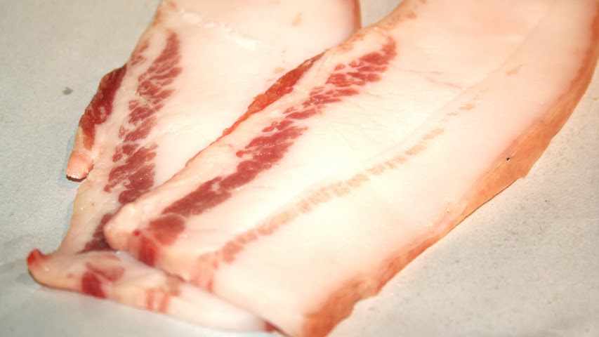Mientras prepara una sartén a fuego suave y pon en ella las lonchas de tocino para que se vayan haciendo poco a poco y derritiendo su grasa en la sartén. Cuando esto haya ocurrido, retira las lonchas fritas y resérvalas.