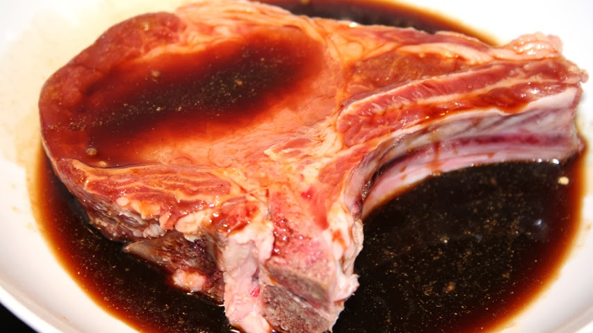He comprado un buen pedazo de chuletero para cortar las chuletas a mi gusto La chuleta marinando en soja y jengibre durante una hora