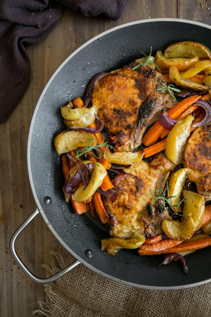 Cuando las verduras lleven 30 minutos en el horno, sacamos las chuletas del refrigerador, calentamos un sartén grande, agregamos un chorrito de aceite y cocinamos las chuletas a fuego medio-alto por aproximadamente 8 a 10 minutos* (4 a 5 minutos por lado) o hasta que estén bien cocinadas y levemente doradas. Finalmente agregar unas ramitas de tomillo o romero y apagar el fuego. (*El tiempo de cocción de las chuletas de cerdo dependerá del grosor de las chuletas. Para verificar que estén bien hechas, deben estar firmes y bien cocidas por dentro.)