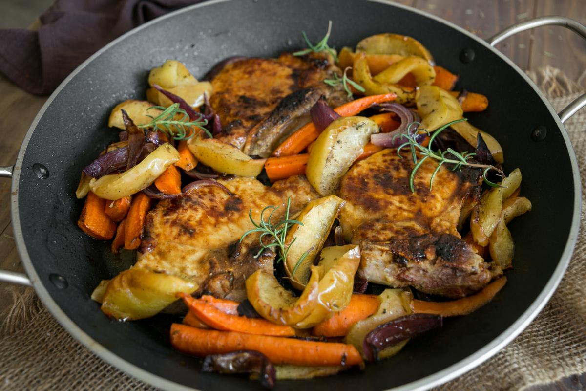 Servir todo en el mismo sartén (chuletas, zanahorias y manzanas) al centro de la mesa para luego repartir en porciones individuales.