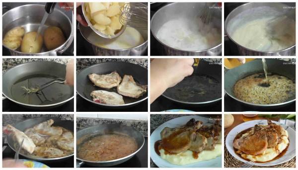 Servimos las chuletas con el puré de patatas y dejamos que la salsa reduzca hasta que este melosa, después la vertemos sobre las chuletas de cerdo y a disfrutar.