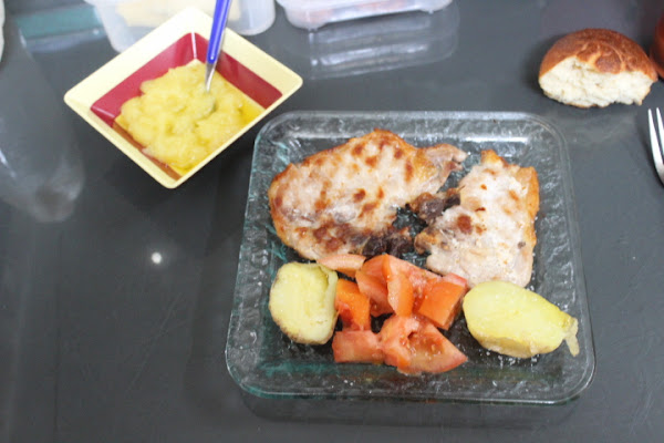 En esta ocasión, no me complique mucho realizando la comida, dos simples chuletas de cerdo al grill doble y dos patatitas al microondas, acompañadas de un tomate troceadito y mientras se cocinaba la comida prepare un all i oli casero.