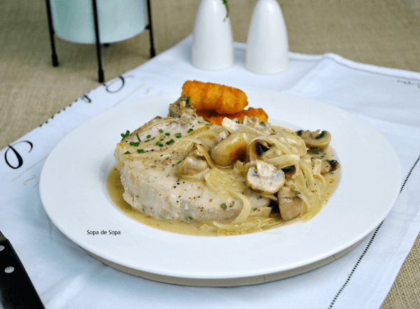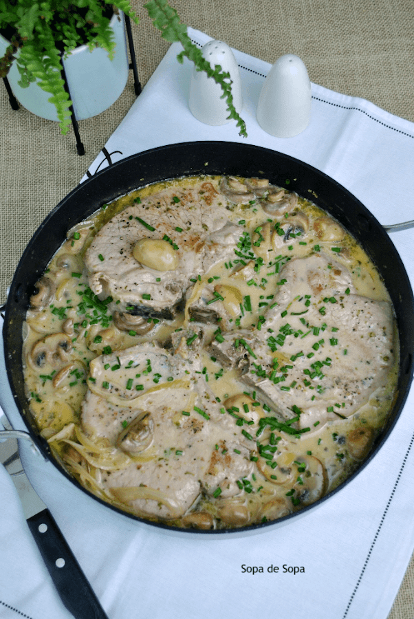 Chuletas de cerdo con salsa de champiñones y cebolla