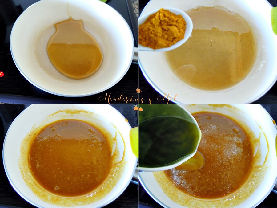 Tal como se vaya fundiendo la miel añade la cúrcuma. Enseguida verás que le da un color intenso y notarás el aroma de la cúrcuma.