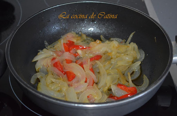 En la misma sartén, freímos las cebollas cortadas en juliana y el pimiento rojo en tiras, hasta que estén blandas.