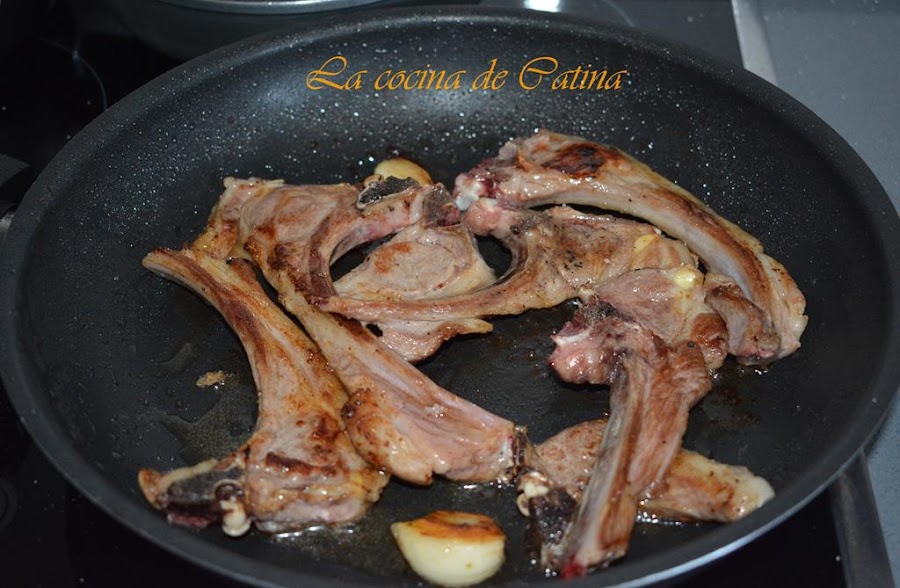 Salpimentamos las chuletas y las freímos en una sartén con aceite por ambos lados con los ajos enteros y pelados. Cuando estan fritas las sacamos y reservamos.