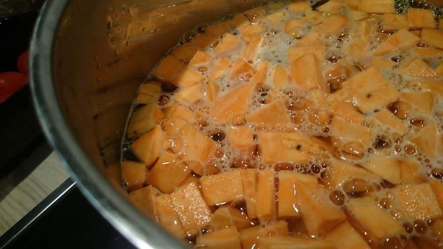 El puré de boniatoPelamos los boniatos y lo troceamos en cuadraditos. Lo ponemos a cocer en caldo de pollo o de verduras hasta que esté muy tierno. Colamos.