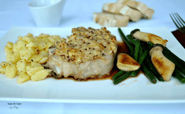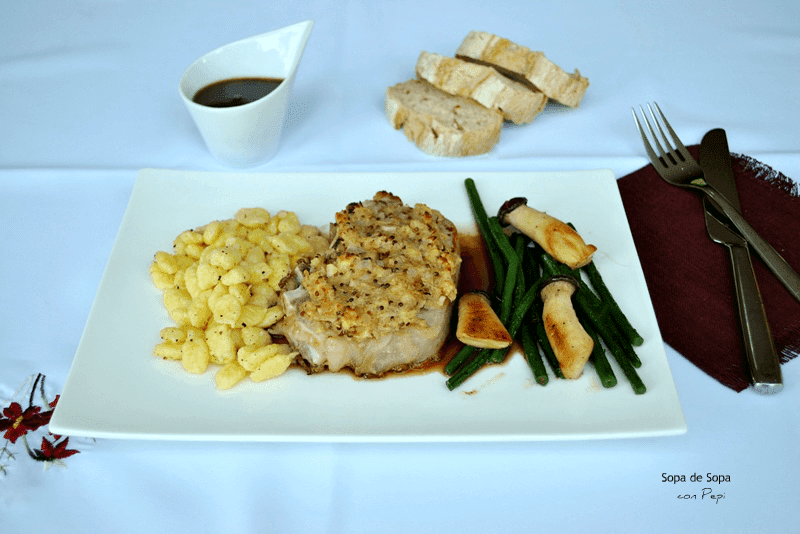 Para servir poner en el fondo del plato un poco de salsa, la chuleta encima y a cada lado una porción de judías con setas y Spätzles. El resto de salsa servir en una salsera.