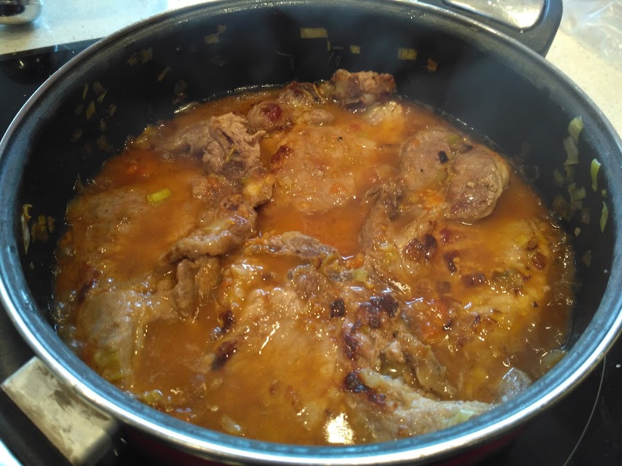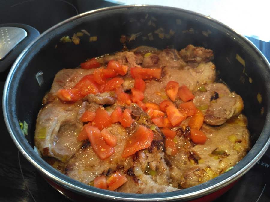 1. En una tartera ponemos a dorar las costilletas con un poco de aceite de oliva por ambos lados y le añadimos la cebolla, el puerro, un poquito de pimienta y un poquito de sal. Dejar hacer.