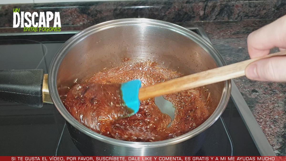 2Pasados un par de minutos, añadimos la salsa de soja, la miel y media cucharadita de romero seco, mezclamos bien y dejamos reducir hasta conseguir una textura similar a la del caramelo.