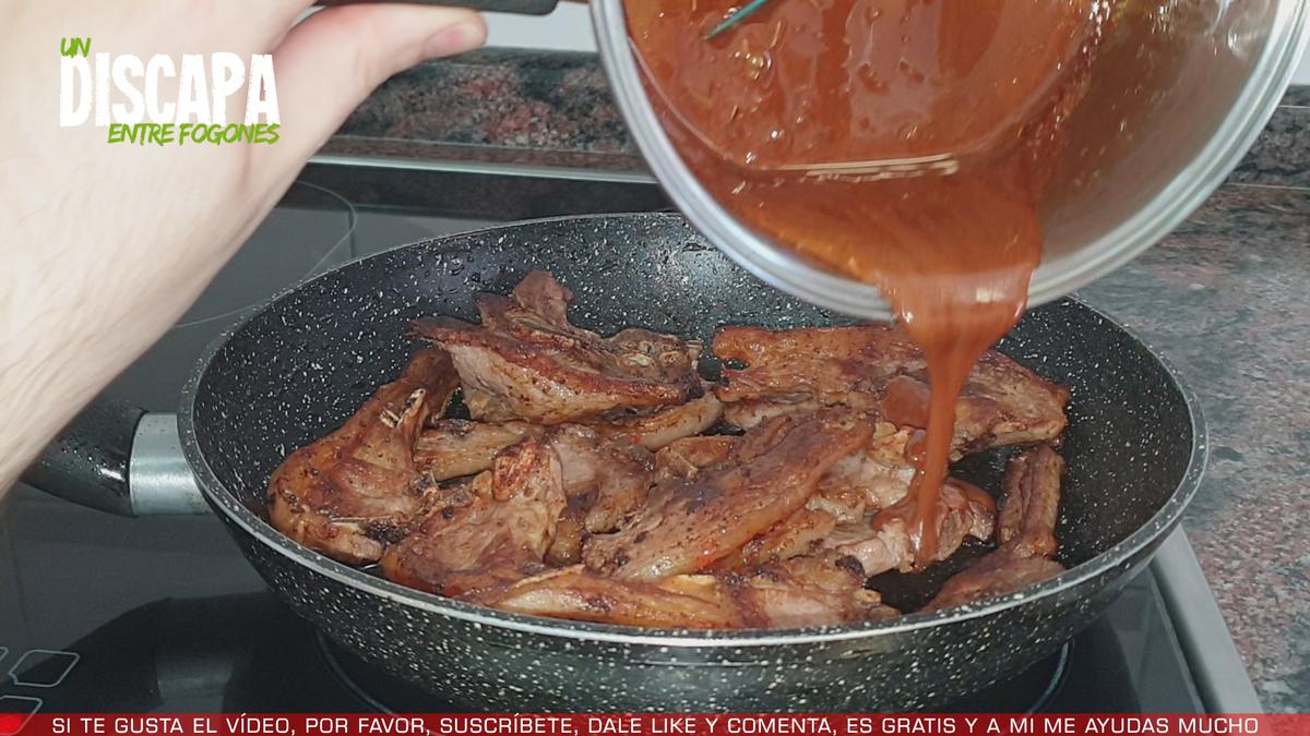 4Cuando ya hemos frito todas las chuletillas las devolvemos a la sartén, y le añadimos el glaseado, damos unas vueltas para que las chuletillas se impregnen bien del glaseado y ya estarían listas!!