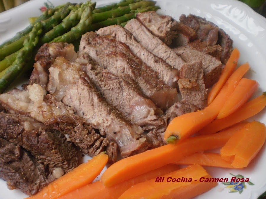 Para acompañar, mientras se hace la carne en el horno, preparar zanahorias al vapor, espárragos verdes cocidos y regados con aceite de oliva virgen y puré de patatas.
