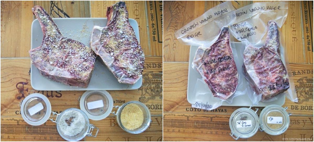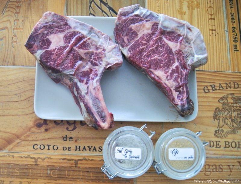 Antes de que empieces a hacer tus fórmulas “científicas” sobre el punto al que quieres tu carne, el tiempo, la temperatura, el grosor… Etcétera, preocúpate de conseguir una carne de calidad, en esta oportunidad nosotros conseguimos unas buenas piezas de carne de vacuno mayor madurada ad-hoc para la ocasión y es que de manera rápida, fácil, sin “sorpresas” a través de Internet gracias a nuestros amigos MLM Productos cárnicos y su página web. Adquirimos 2 chuletones de vaca mayor con una curación dry aged perfecta, con un marmoleo de grasa infiltrada que prometía, y claro, no defraudó, solo tienes que ver nuestras fotos. Una vez consigas tus chuletas, solo debes que seguir nuestras instrucciones y no tienes que preocuparte de nada más.