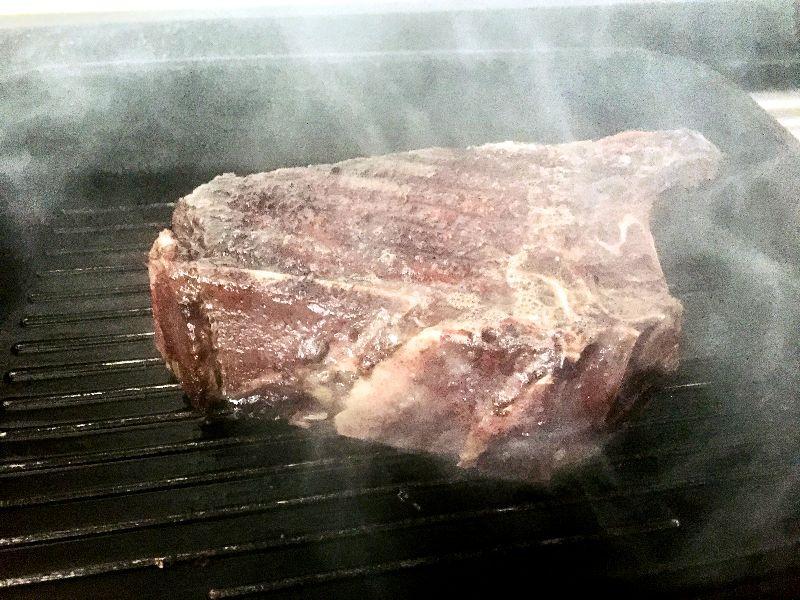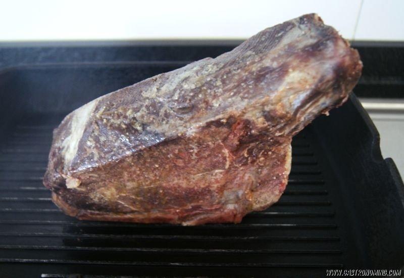 5. Ponemos a calentar a fuego medio alto una sartén o carmela de hierro fundido hasta que este muy caliente, hasta que empiece a humear, solo en ese momento pondremos nuestra chuleta del lado del hueso y del lado “frontal” es decir, los cantos y las cocinamos 2 minutos por cada canto.
