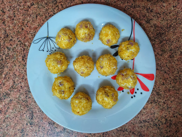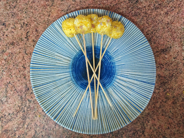Rebozamos las bolitas en las patatas fritas y finalmente las pinchamos en los palitos de brochetas.