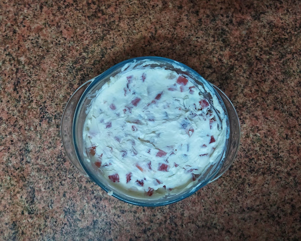 En el recipiente mezclamos los dos tipos de queso con los taquitos de jamón, y removemos buen hasta que todo se integre y nos quedé una masa homogénea.