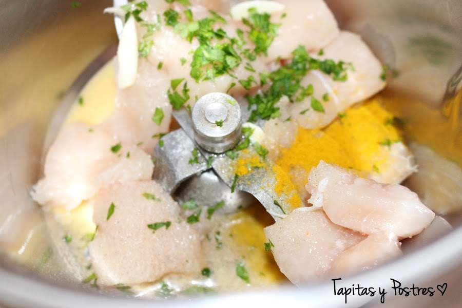 Ponemos el pollo, perejil ajo, huevo y especias y trituramos.