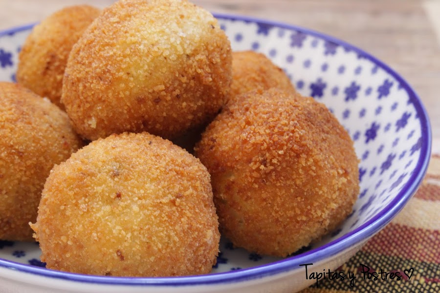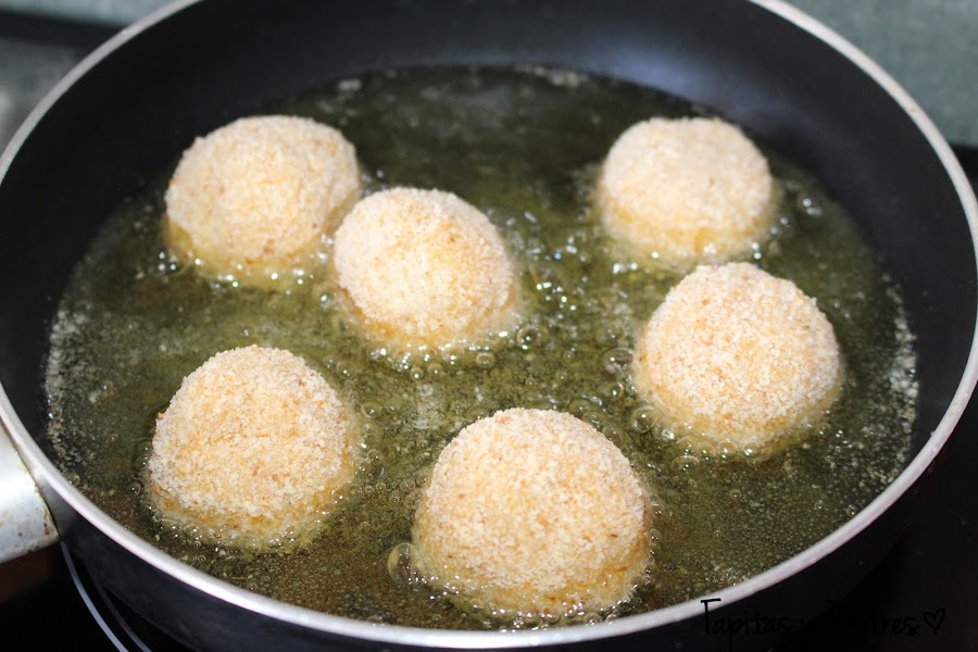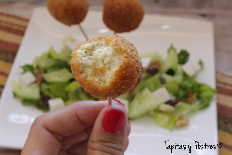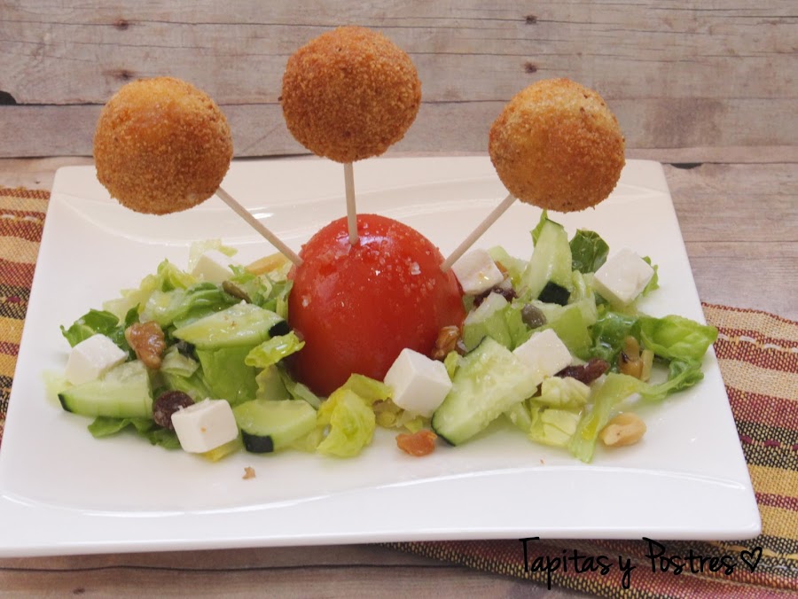 Hacemos bolas no muy grandes y las pasamos por pan rallado, huevo batido y de nuevo pan rallado. Las freímos en abundante aceite caliente hasta que estén doradas. Dejamos sobre papel absorbente para escurrir un poco el aceite y pinchamos con brochetas pequeñas. Acompañamos con una ensalada completa. Para presentarlos los he pinchado sobre medio tomate.