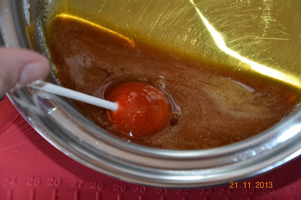Cuando el azúcar ya esta caramelizado empezamos a pasar las piruletas por el caramelo inclinando la sarten para no tocar mucho las paredes de la misma que estarán muy calientes y nos fastillará nuestros tomatitos.