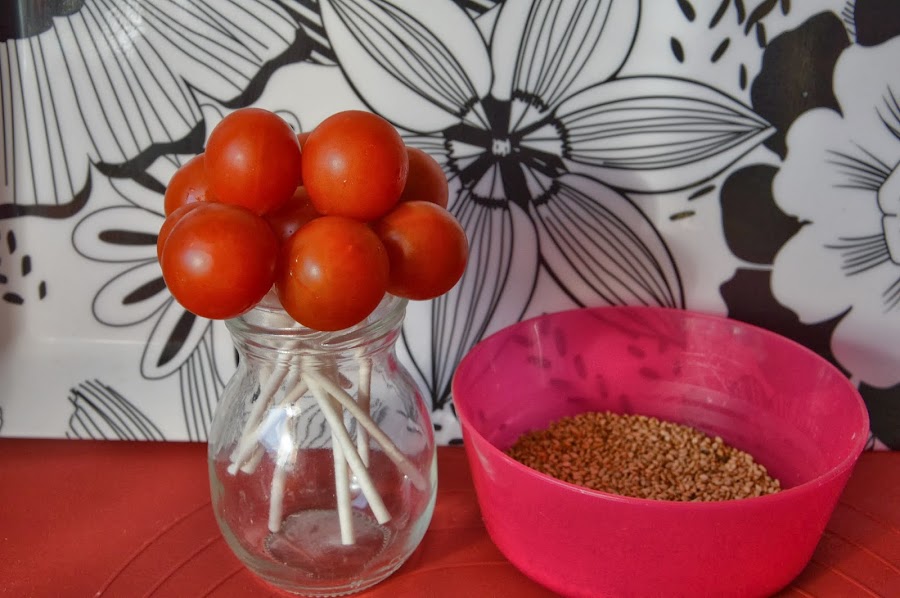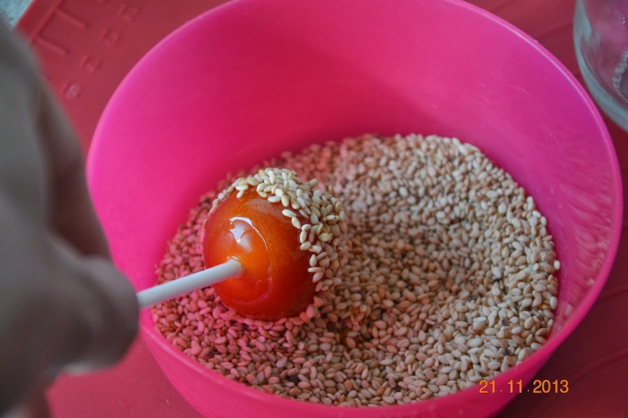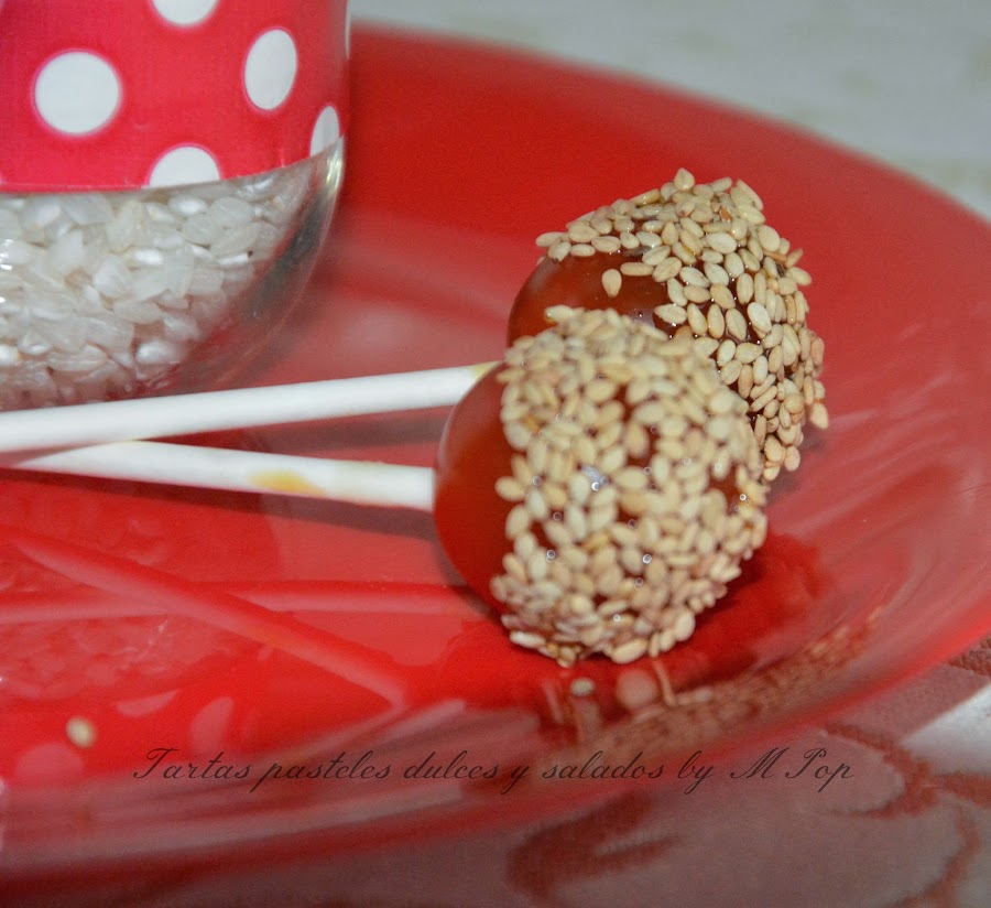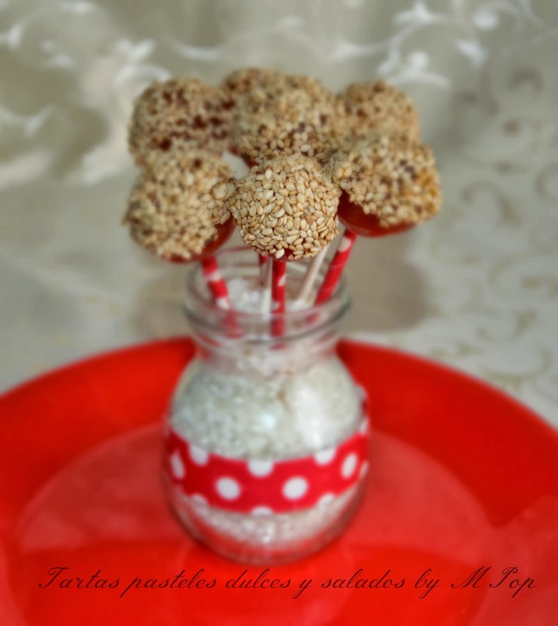 Introducimos el tomate un el recipiente con el sésamo y rebosamos o podemos esparcir con la