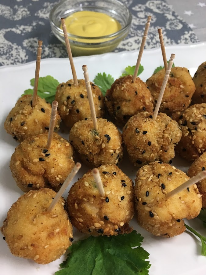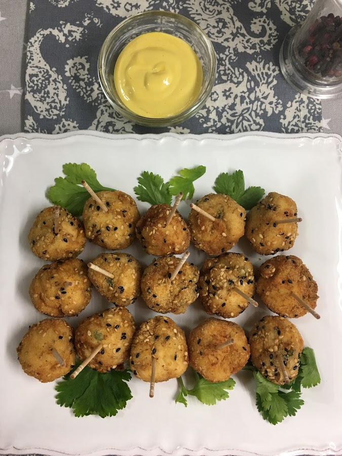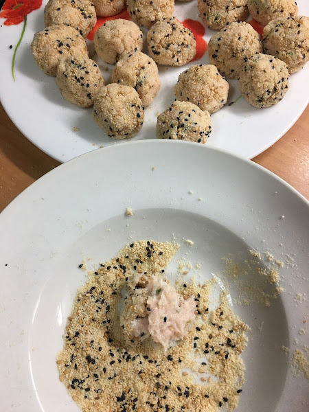 Se pone en un plato sopero el pan rallado mezclado con las semillas de sésamo de los dos tipos. Se hacen bolitas como si fueran albóndigas con las manos y se rebozan en la mezcla anterior.